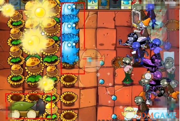 2、打不过的在前方放高冰果阻拦,在后方放豌豆加农炮攻击僵尸。