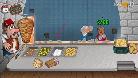 答:在第一天准备配菜,点击长刀割肉,长按土豆切条,点击饼皮,卷起来点击纸袋即可