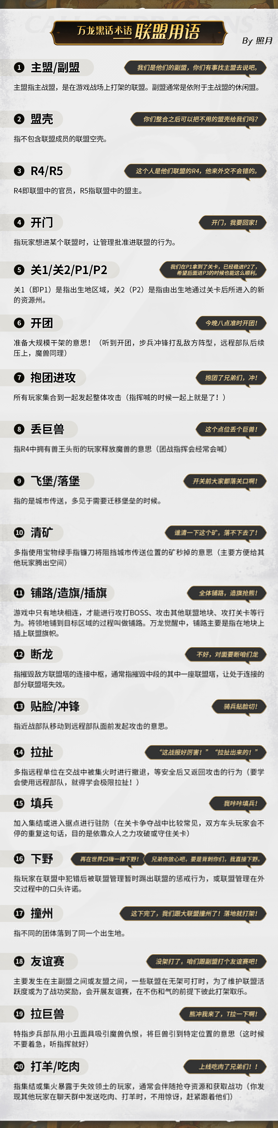 《万龙觉醒》加入经典RTS真实射程机制,真正做到在短兵相接前,远程单位就在数里之外输出。既有精灵弓箭手、人族弩车、兽族投矛手这样灵活的高输出兵种,也有修女、半羊人咒术师、长须树精这些射程更长的法术单位。下面是小编给大家带来的《万龙觉醒》万龙黑话术语大全,感兴趣的小伙伴们一起来看看吧。