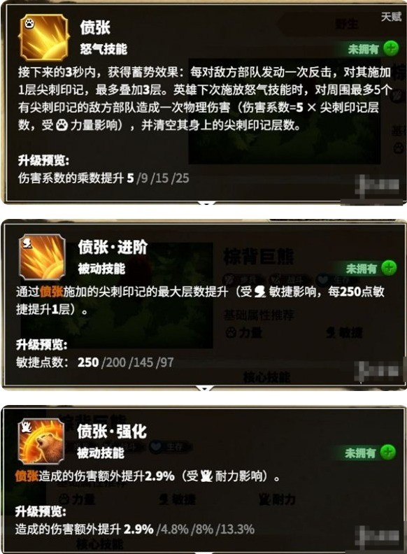 “偾张”、“偾张·进阶”、“偾张·强化”、“回击”、“回击·进阶”、“回击·强化”、“爪牙”、“疏狂怒吼”。