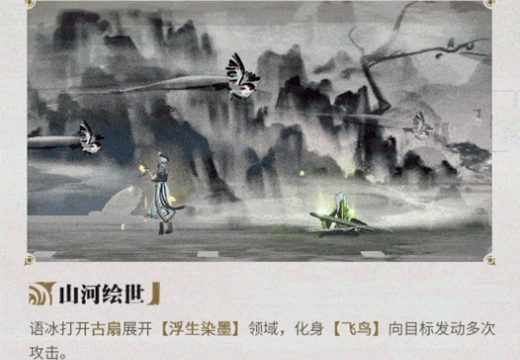 语冰打开古扇展开【浮生染墨】领域,化身【飞鸟】向目标发动多次攻击。