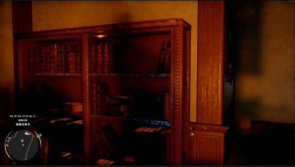 书架是一个旋转门机关,通过旋转门进入隐藏房间,在房间内找到项链拾取。