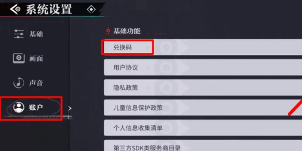 3、进入系统设置中后,点击左侧菜单栏中的“账户”选项,就可以找到兑换码入口了。