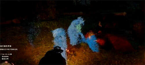 * 对准鬼影:你会发现提灯发光区域有蓝色的光影。保持提灯举起状态,将准星对准死牛附近的蓝色鬼影区域。