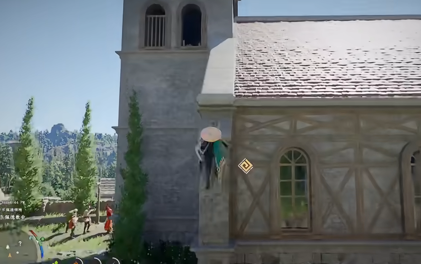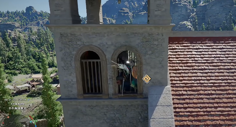 接着爬上教会钟楼,敲击钟声可解锁该区域地图视野。需要注意的是,钟楼正门无法直接进入,玩家需要绕到北侧,通过破窗爬入内部。