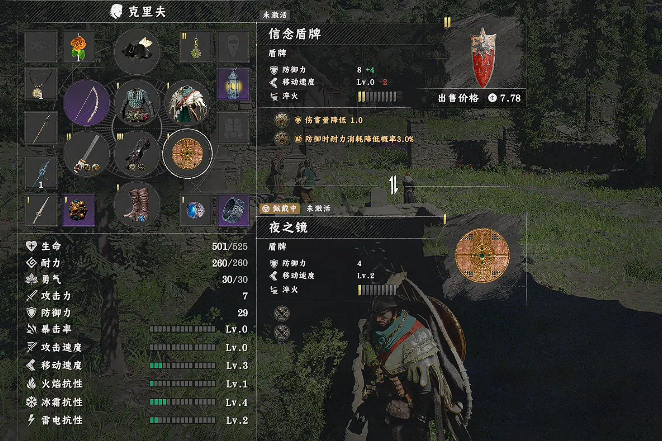 关于盾牌效果,信念盾牌拥有高防御属性,自带防御淬火等级。其核心优势在于伤害减免,以及在格挡时减少耐力消耗。不过该盾牌体积较大,且无移动速度加成,适合防御型玩法。