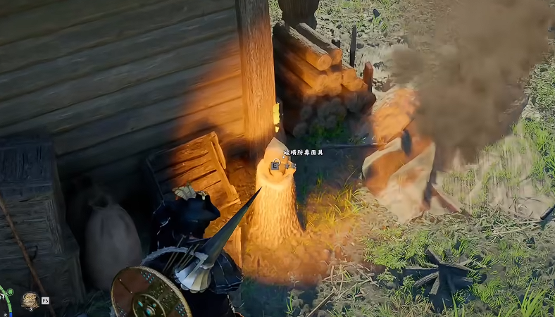 第三步,将会在屋子角的木桩上找到硫磺防毒面具。