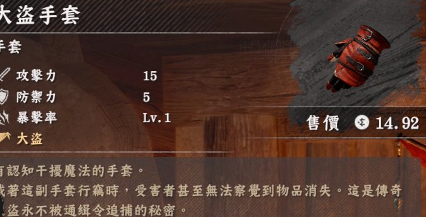 大盗手套是红色沙漠中完成瑟金斯家族支线任务遗失印章的秘密后获得的奖励道具,其核心效果是在扒窃时不会被发现,堪称偷取贵族金条的最佳辅助工具。不过玩家需要注意,该手套并不会降低被抓后的罚金,主要作用在于防止被发现。
