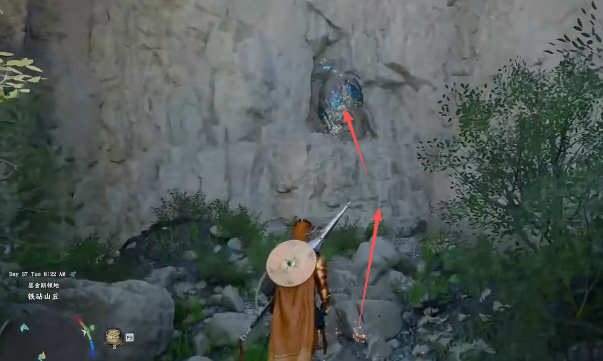 找到岩壁上的蓝色发光洞口,请注意图中箭头指向的具体位置