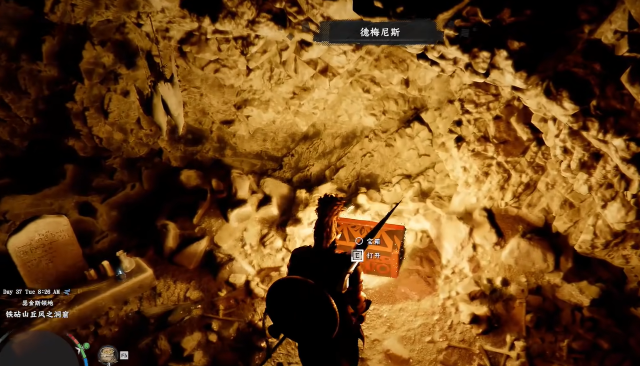 攀爬至岩壁洞口,进入洞窟后,在石质通道内找到红色宝箱
