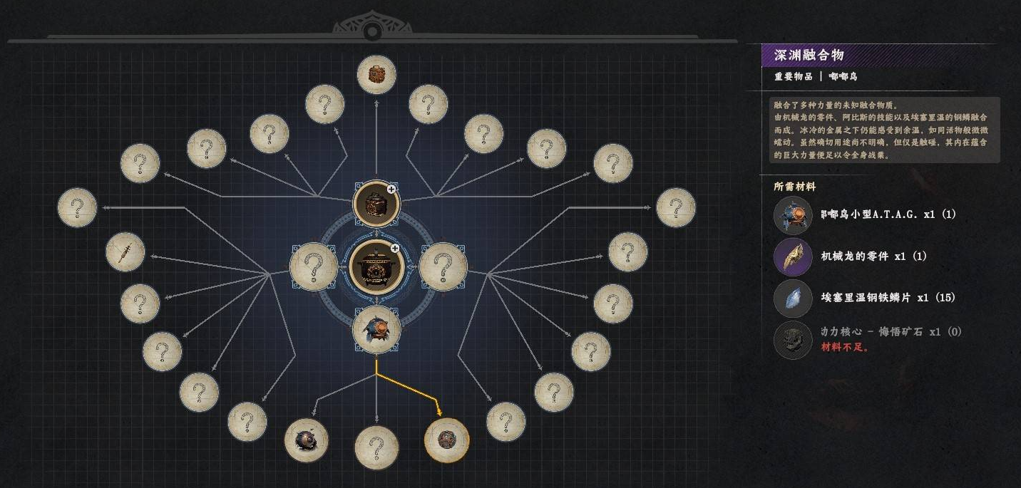集齐所有材料后,返回埃尔南德城西边的格林尼尔嘟嘟商店,选择制作深渊融合物。