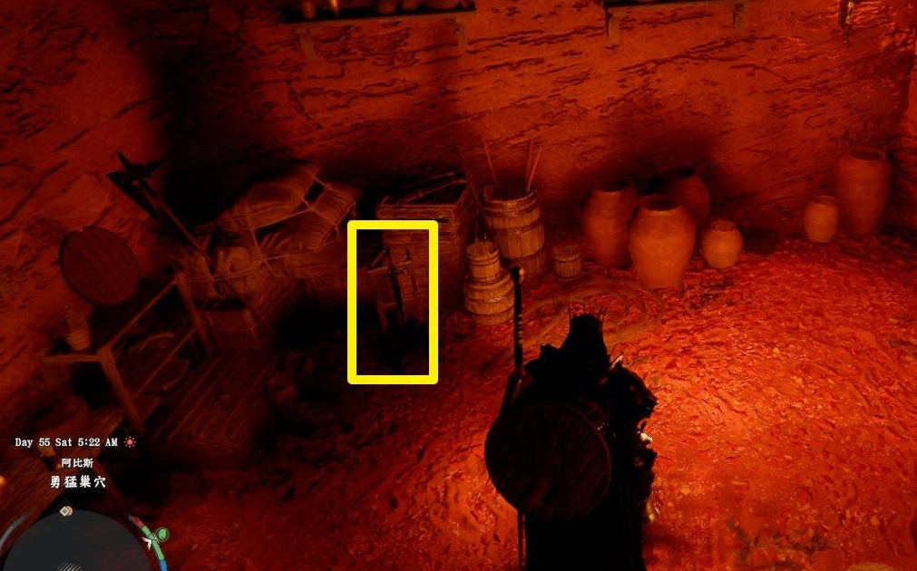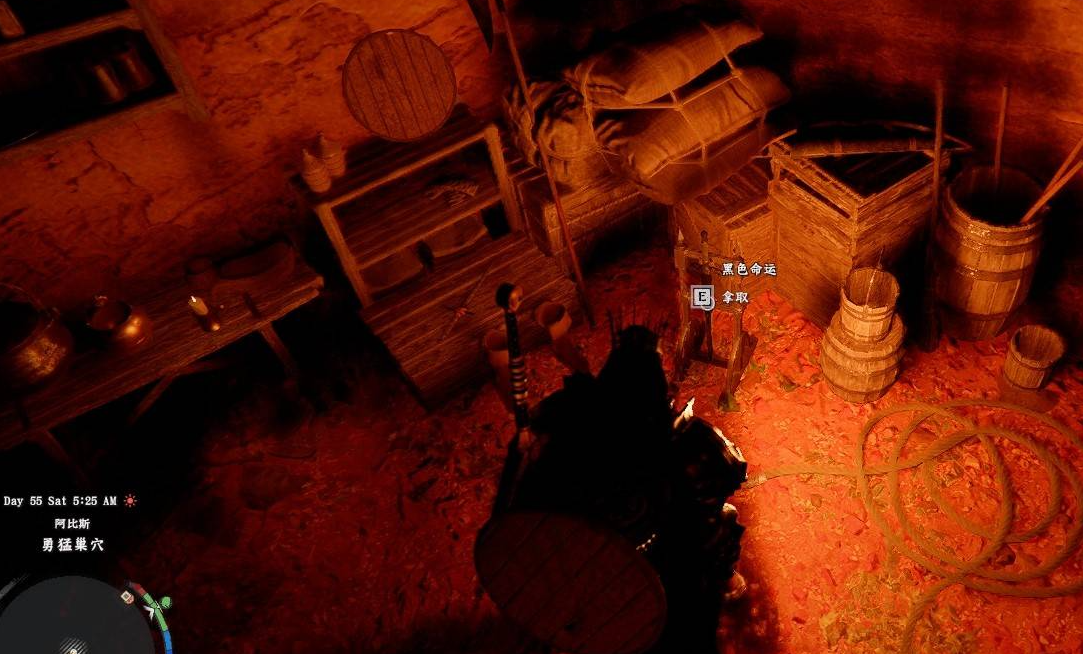 在此处右转,可以看到一个洞口,进入洞口,在房间角落的架子上拾取单手剑黑色命运