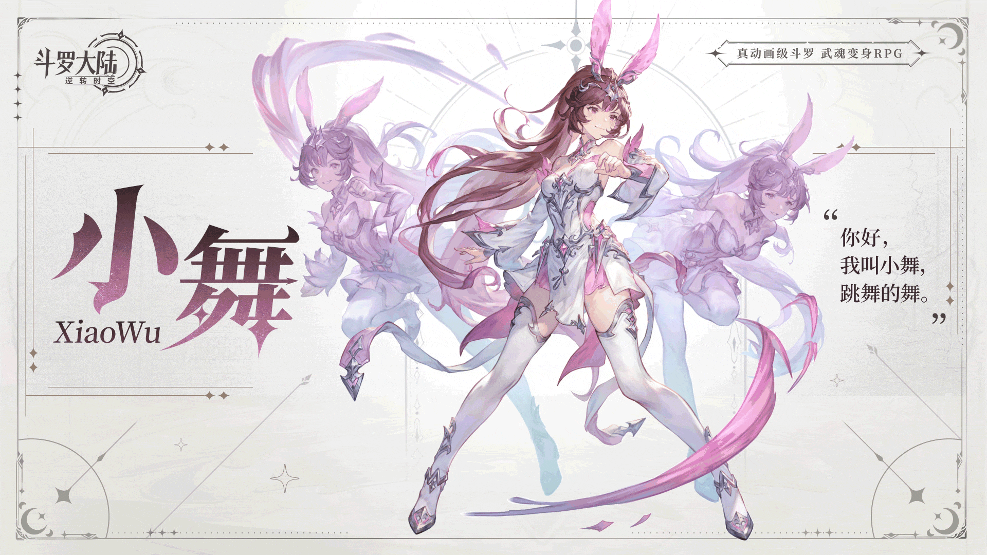 小舞是十万年魂兽柔骨兔重修化形成人,初代史莱克七怪之一,年龄排行第五,外号"柔骨魅兔"。在《斗罗大陆:逆转时空》里,小舞的定位是控制和伤害提升,开启武魂真身后,可以极大提升对敌方造成的额外伤害。一系列连击打得敌人猝不及防,太飒啦小舞姐!