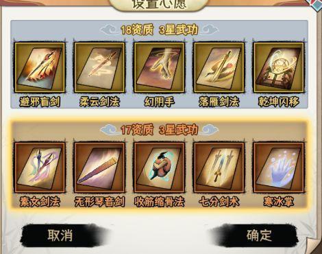 心愿配置:辟邪、乾坤必要,柔云、幻阴防守,落雁输出,七分、素女保证输出,琴剑、缩骨、寒冰掌都可以看情况换,心愿抽多了,17资是迟早会溢出的。