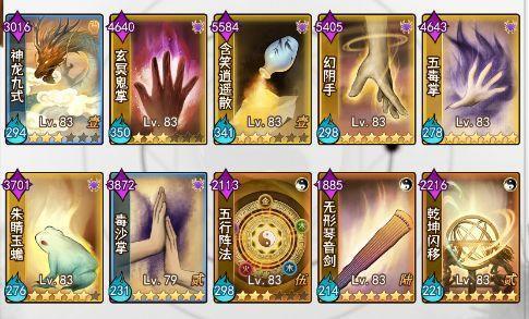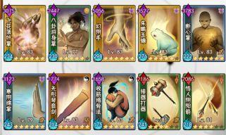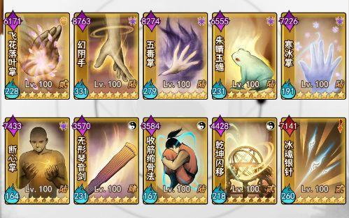 卡组内武功大部分都可以扫荡精英副本、新区活动免费获取。利用上清+素女+暴雨针给对方频繁造成兵刃外伤的同时,暴雨针还可以给对方牌库生成废牌,输出利用震天掌的痛内触发武当的减内,前期输出可以主要升级进阶这几个武功。