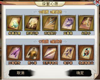 卡组搭配不用固定,尽量根据自己的牌库灵活搭配,高级探索500次后解锁了心愿探索,有心愿后木王神鼎高级十连改为心愿十连,心愿的配置:朱晴玉蟾、五毒掌、乾坤闪移、幻阴手、冰魂银针、五毒秘传、断心掌、无形琴音剑、毒沙掌、收筋缩骨法