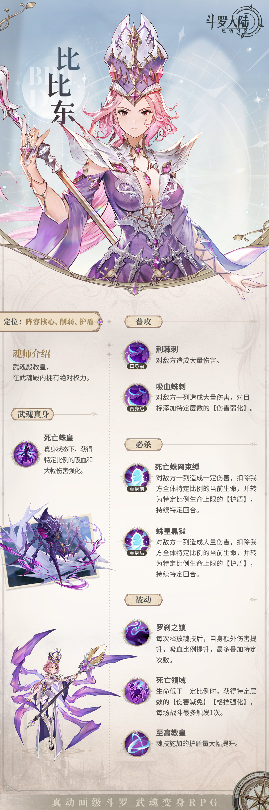 比比东,武魂殿末代教皇,武魂帝国开国女皇兼末代皇帝,一级神祇·罗刹神,斗罗大陆两万年来第三位成神者,杀戮之都十位杀神之一。游戏中比比东的定位是阵容核心,削弱,护盾,开启武魂真身后,会获得特定比例的吸血和大幅伤害强化。