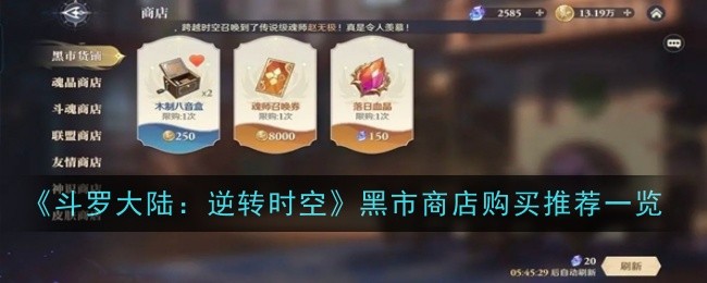 《斗罗大陆:逆转时空》中玩家们可以在黑市商店获取珍贵的物品,玩家们可以通过使用金魂币进行购买,每天有一次刷新机会,接下来小编就为大家带来具体的购买推荐,有需要的小伙伴们可以自行查看。