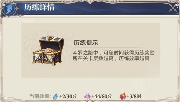 另一种是历练奖励,我们可以在左侧查看自然累积的资源,关卡推进层数越高,历练获取的奖励效率就越高。除了自然累积的奖励外,我们也可使用“快速历练”来获取480分钟的历练奖励。前期落日血晶、魂荧砂缺口较大并且对于战力的提升较明显,有条件建议多次花费魂晶快速历练。许多萌新可能会觉得没必要练这么多系魂师,玩哪队就参与哪队试炼即可,但综合试炼、五系试炼均可产出资源,短期来看差距不大,但中长期的差异就特别明显。