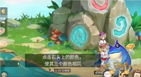 3、能够看到这个石头上面有相应的提示。将石山上的石头点亮使其都变为同一颜色即可。