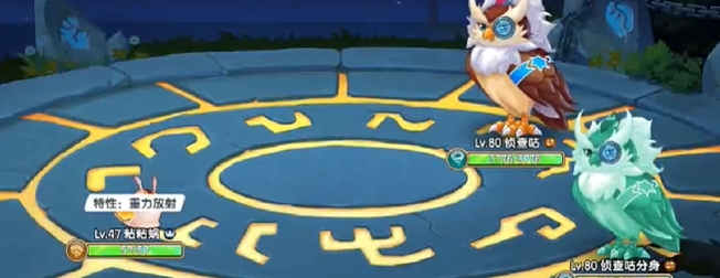 2、先用粘粘蜗使用“重力放射”特性降低对侦查咕的伤害,再更换为带有“遗志”特性的哈尼熊,技能选择仪式。