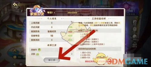 3、接着在家族工作页面,点击下方的领取即可获取家族工资;