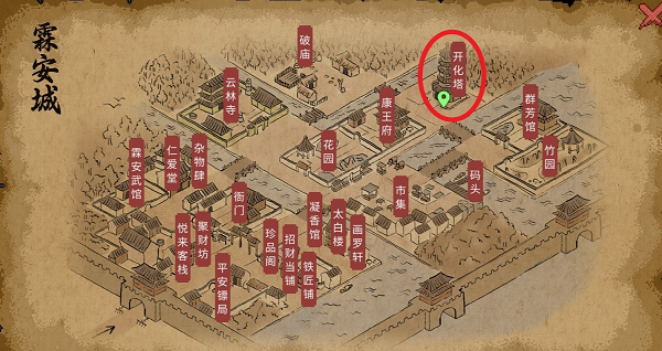 1、先前往霖安城的【开化塔】,来到塔顶过完和康王府、佟道辅有关的剧情。