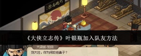 大侠立志传叶银瓶怎么加入队友?大侠立志传中想要叶银瓶成为队友的话,那么玩家在叶银瓶判案任务中必须选择正确的选项才能招揽叶银瓶,但是一些玩家不清楚正确选项是什么,所以小编为各位带来了大侠立志传叶银瓶加入队友的方法,希望能够帮助到各位。