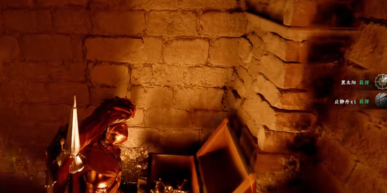 最后是破暗门进密室,先用坚守技能开启防御姿态,再用劲法攻击标记处墙面,暗门会被轰开。注意必须先坚守再劲法,顺序错误无法打开。进入暗门后的小密室,打开唯一宝箱即可直接获得黑太阳盾牌。