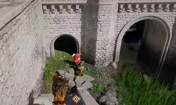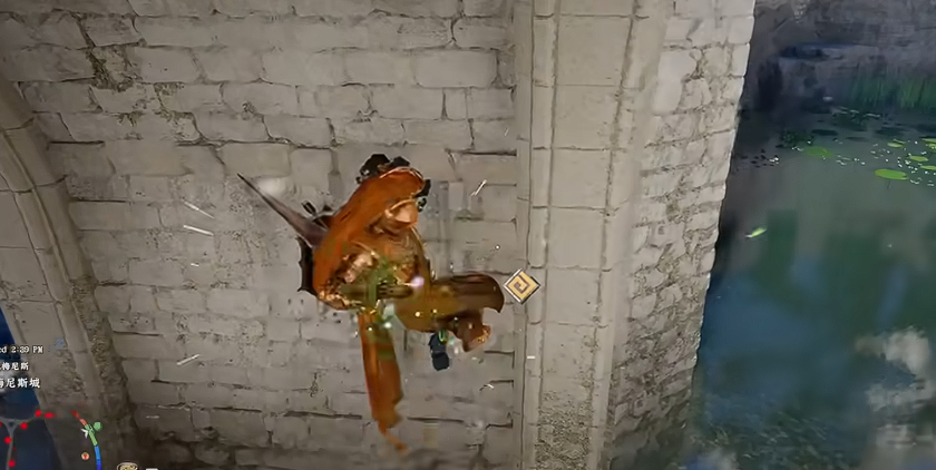 其次是攀爬至标记点,沿桥墩墙面攀爬,爬到树叶标记正下方或正前方的可站立平台,标记处就是暗门位置。