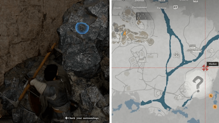 随后向东前往地图标记的位置,在一处巨大悬崖的底部找到铁矿脉。