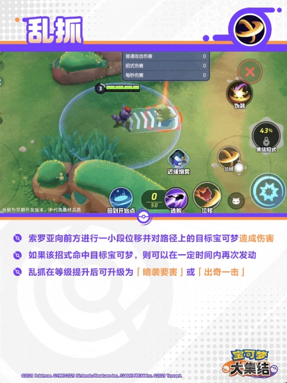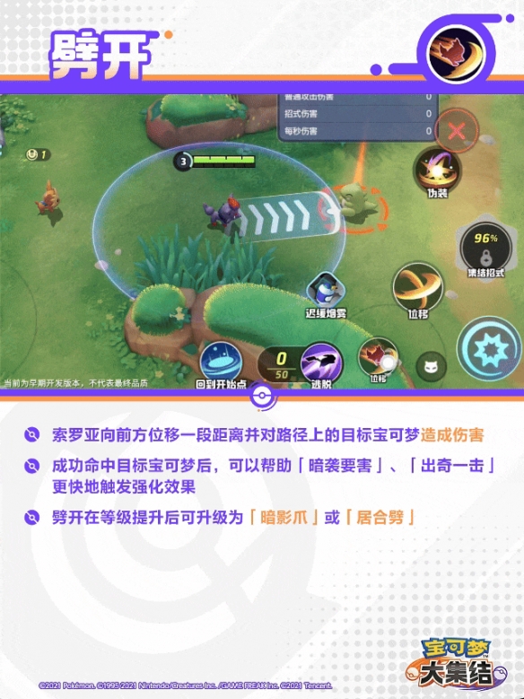 索罗亚克向前位移并对路径上的目标宝可梦造成伤害。若位移过程中成功命中目标宝可梦,则在位移起点处生成一个特效标记点。