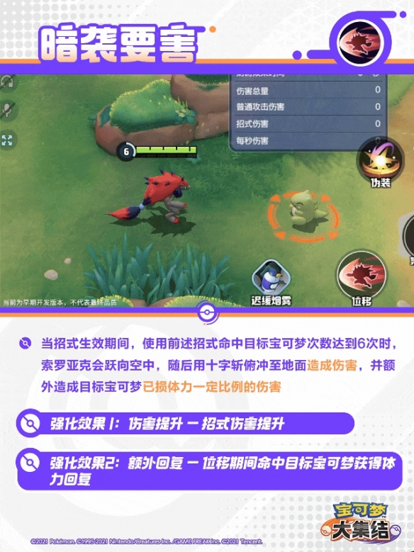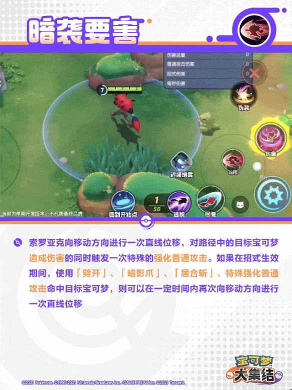 索罗亚向前方位移一段距离并对路径上的目标宝可梦造成伤害,成功命中目标宝可梦后,可以帮助「暗袭要害」、「出奇一击」更快地触发强化效果。