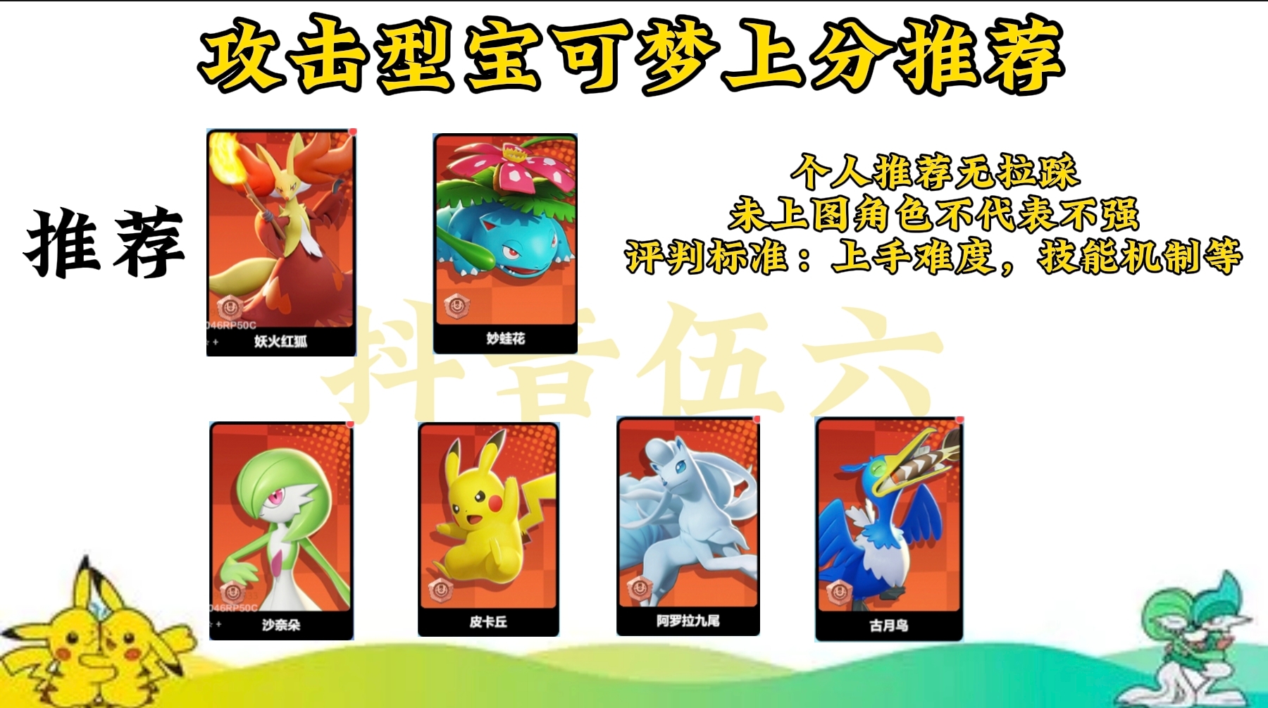 攻击型宝可梦上分推荐,我个人比较偏向于简单操作,控制,跑得快类型的角色,所以我个人推荐妖火红狐和妙蛙花这两个