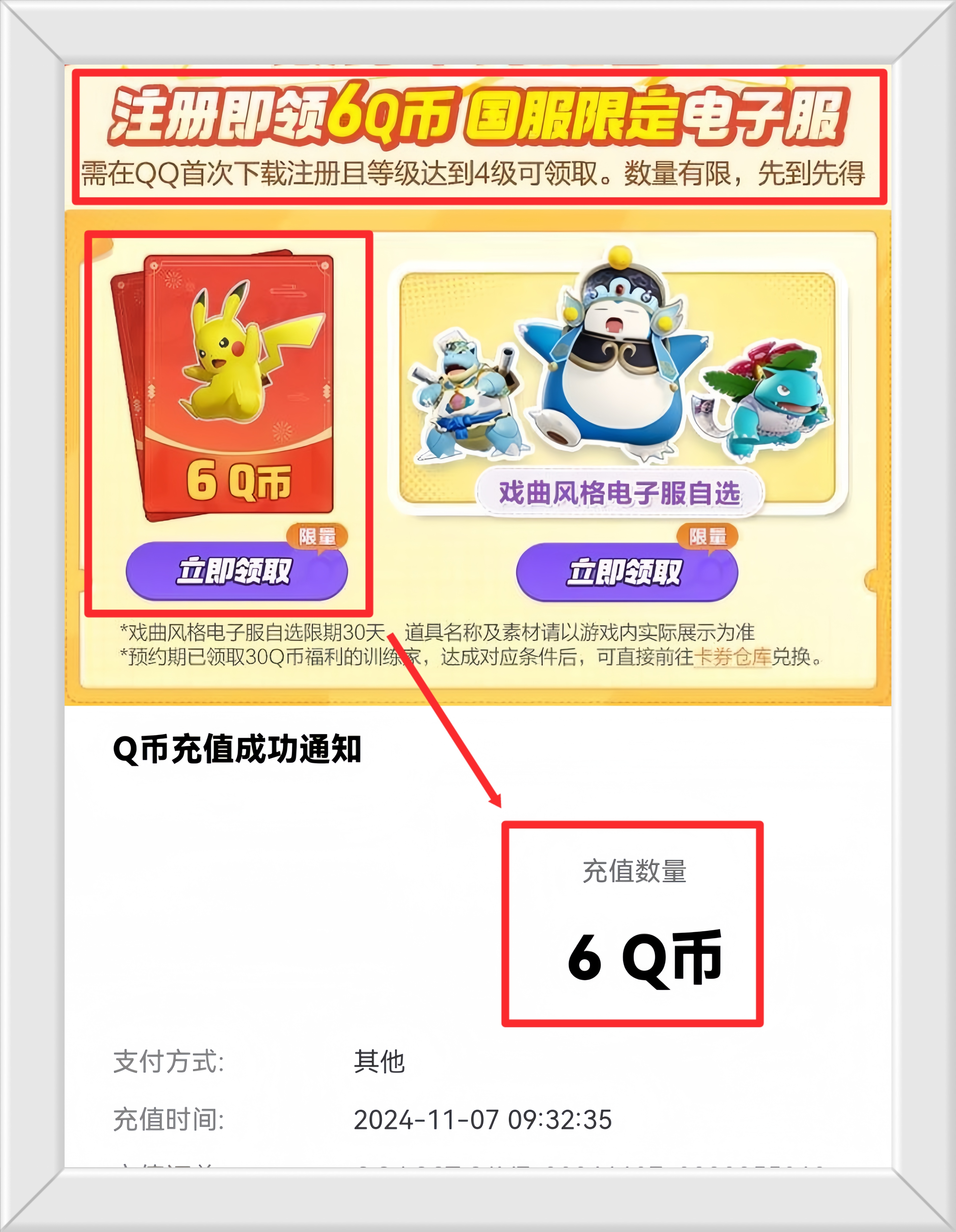 1、宝可梦大集结手游开服福利[注册即领6Q币 需要在QQ游戏中心首次下载注册且等级达到4级可领取。数量有限,先到先得]。