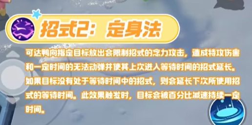 可达鸭向指定目标放出会限制招式的念力攻击,造成特攻伤害和一定时间的无法动弹并使其上次进入等待时间的招式延长,如果目标没有处于等待时间中的招式,则会延长下次所使用招式的等待时间。此效果触发时,目标会被百分比减速持续一定时间。