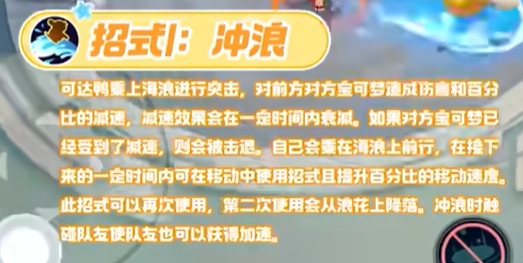 可达鸭乘上海浪进行突击,对前方对方宝可梦造成伤害和百分比的减速,减速效果会在一定时间内衰减。如果对方宝可梦已经受到了减速,则会被击退。