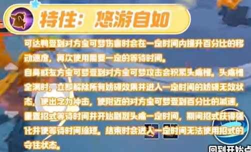 可达鸭受到对方宝可梦伤害时会在一定时间内提升百分比的移动速度,再次使用需要一定的等待时间。