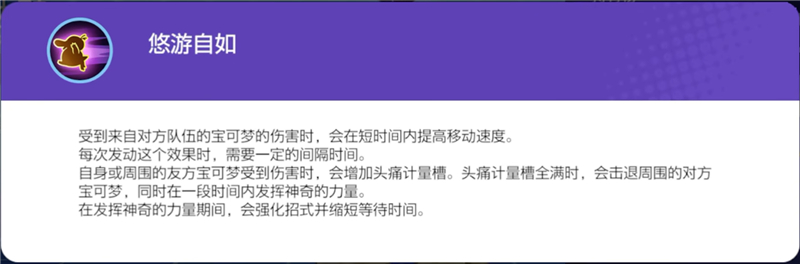 可达鸭的特性是【悠游自如】,当受到对方宝可梦伤害时,会在一定时间内提升移动速度。