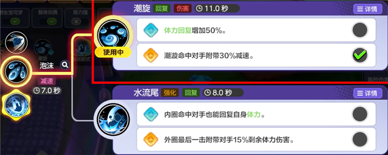 潮旋,召唤四个旋涡围绕自身旋转,每次触碰到敌人造成25点加35%攻击力的伤害,并恢复体力。