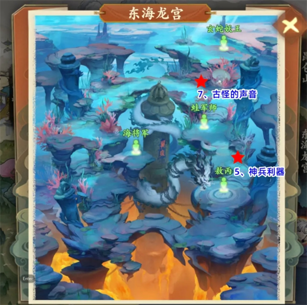7、东海龙宫,右上角龙宫侍女-下面中间的桥上触发剧情-桥上小跳蛙