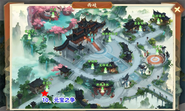 10、西岐,右下角寻宝妖旁边的守卫-右下角水车旁边的地下拿碗-船旁边的台阶上打水-回去找守卫