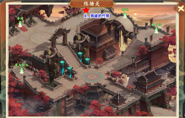 8、陈塘关,右上角兵器架旁边地下的竹简-右下角出了城门触发剧情-地下的盒子-李靖-出城门