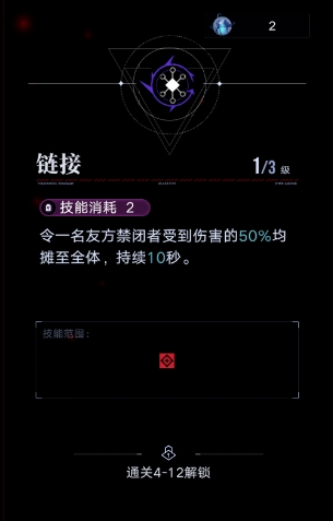 令一名友方禁闭者受到伤害的50%均摊至全体,持续10秒。
