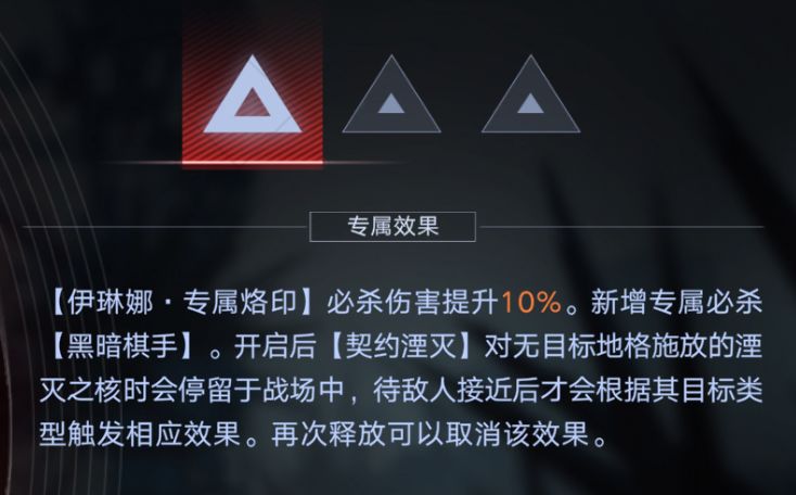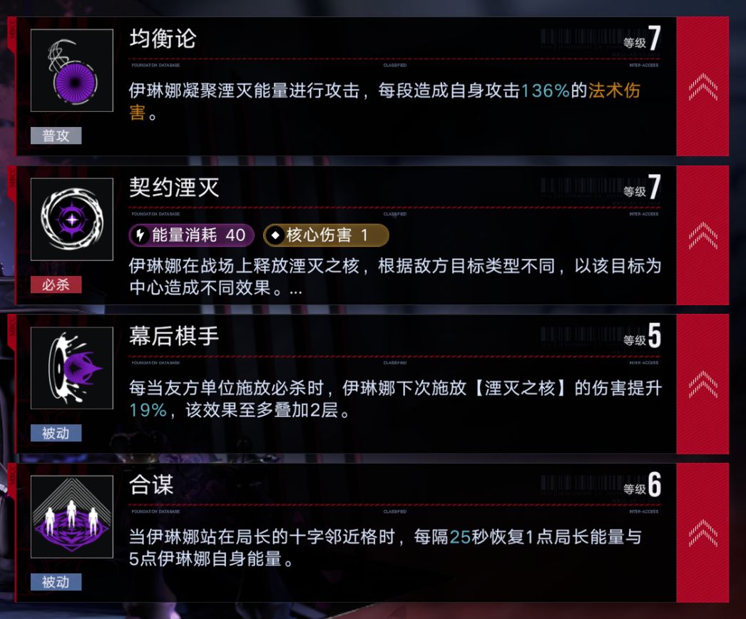 队友释放技能后可以提升伊琳娜大招的伤害,最多提升3层(1枷锁),所以在部分需要追求极限伤害的副本中,可以利用操作来一定程度上提升伊琳娜大招的爆发力最后可以同时回复局长与自身能量的效果也是伊琳娜被大家称为充电宝的最大原因,且这个效果的实战反馈那真可谓是神技一般的存在