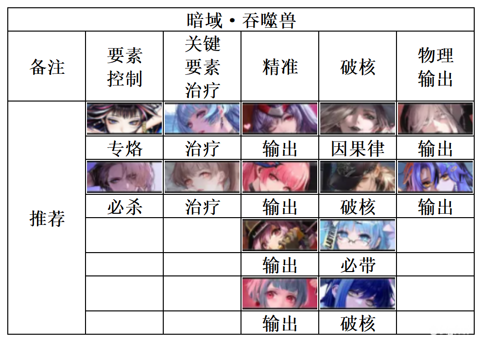 吞噬兽是顶替原“灰发少女”的位置,特色属性是生命S,理论上队伍通用,较为推荐队伍是“物理队”,推荐角色如上。