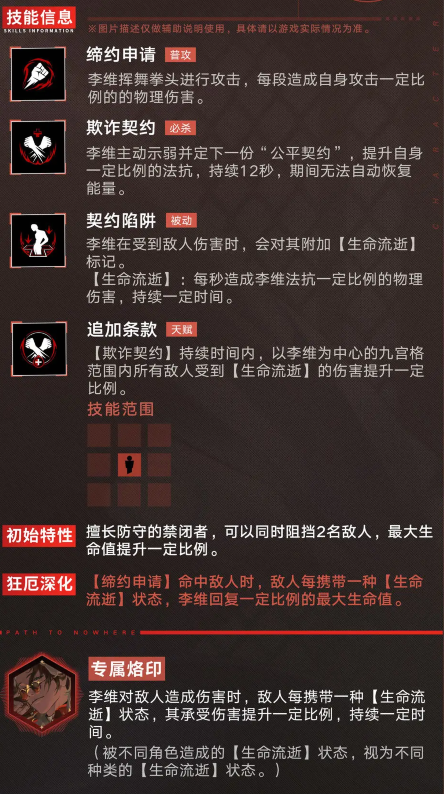 李维的4技能被动是可以提升李维在大招持续期间,九宫格范围内敌人所受到的【生命流逝】伤害,并且这里维一预估是所有不同角色所施加的【生命流逝】伤害都会有所提升,如果这点确定的话,那么李维在未来的【生命流逝】队伍中的角色就会比较重要了。