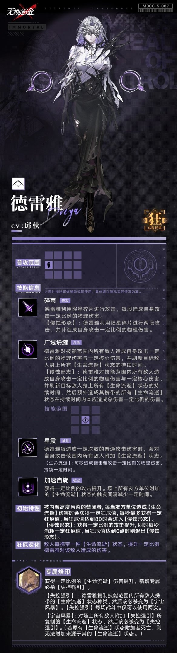 无期迷途德雷雅怎么样?无期迷途全新狂级禁闭者德雷雅现已上线,一些小伙伴还不清楚德雷雅怎么样,下面小编就给大家带来了无期迷途德雷雅技能介绍,一起来了解一下吧。