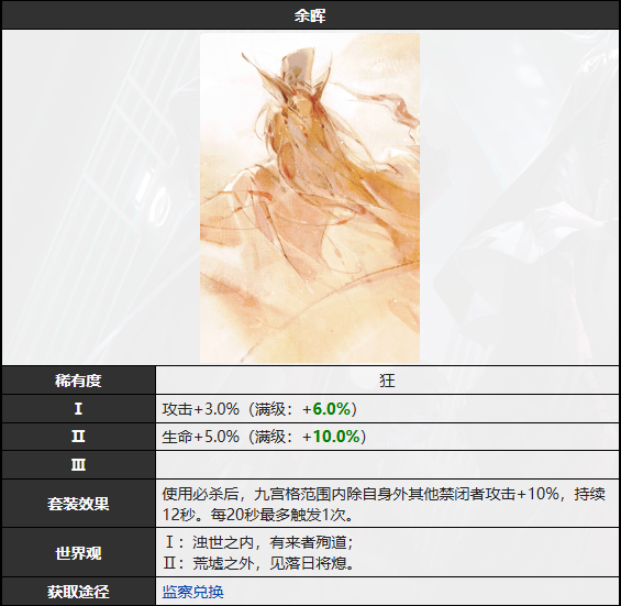 在《无期迷途》余晖烙印中使用必杀后,九宫格范围内除自身外其他禁闭者攻击+10%,持续12秒。每20秒最多触发1次。接下来就由小编给大家带来了详细的《无期迷途》余晖烙印图鉴,希望这篇文章可以帮到大家。