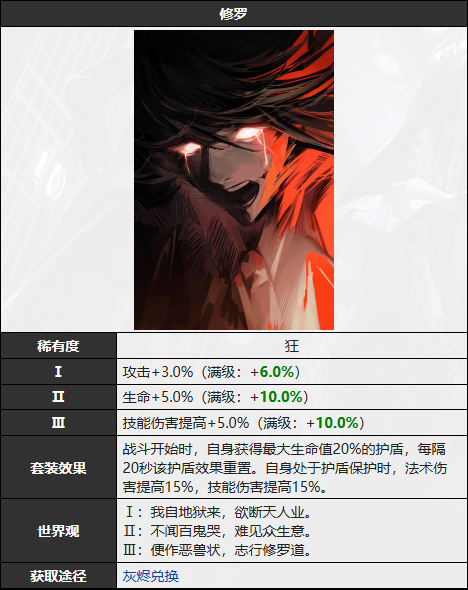 在《无期迷途》修罗烙印中战斗开始时,自身获得最大生命值20%的护盾,每隔20秒该护盾效果重置。自身处于护盾保护时,法术伤害提高15%,技能伤害提高15%,接下来就由小编给大家带来了详细的《无期迷途》修罗烙印图鉴。